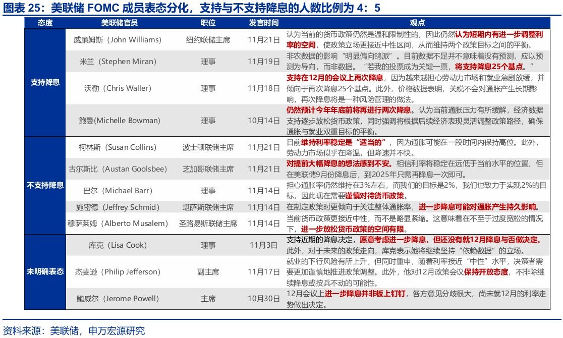 格隆汇11月23日|申万宏源研究认为,12月暂停降息的概率或更高,最大不确定性来自于鲍威尔如何塑造“共识”。在10月美联储例会上,鲍威尔曾表示美联储内部对于未来降息的分歧非常大。近期公布的10月会议纪要也显示,“许多”(many)参会者支持保持利率不变,仅“几个”(several)参会者认为继续降息是合适的。近期,拥有投票权的FOMC成员表态显示,支持与不支持降息的人数比例约为4:5,后者略占上风。库克、杰斐逊、鲍威尔尚未对12月降息明确表态——9月点阵图支持年内降息3次,使得这三人的政策倾向成为降息与否的核心“选票”。换句话说,鲍威尔如何在美联储内部建立、引导“共识”至关重要——但自10月会议以来,鲍威尔尚未发表立场表态。