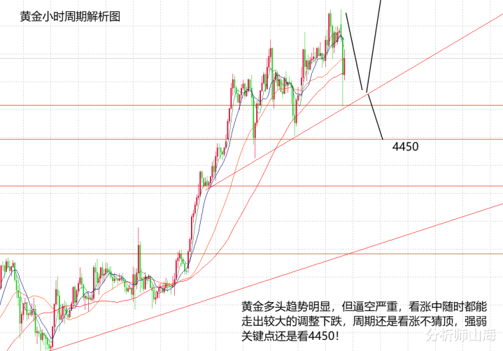 本周市场的基本看法和交易原则保持不变,基本看法是看涨,交易原则还是等待每天的调整做多,只要大方向不变,交易原则就不变,即使它每天都刷新高点,但没有回落到我们认为的关键点,交易是宁错过不做错,所以,本周更多的建议是多观察,少操作。就目前市场热度来看,上周的连续大涨,每天刷新高点,但今天早盘开盘,出现了暴涨空间,可看出市场已经出现了疲软的状态,那么,本周有可能会出现上周的回吐空间,上周起涨点在4336,本周如果跌倒4336后,市场就由极强转为高位震荡,到时候市场相对回归正常,就可以做技术面的涨跌空间。当然,在技术面内,本周的强弱关键点在4450,4430,周期性没有破位4430也很难走出报复性的下跌,市场在多头趋势中还是延续强势继续上涨,所以,本周黄金看涨关注4450,4430两个点位得失,而顺势上涨则先看4550新高市场破位,然后再看延续性。