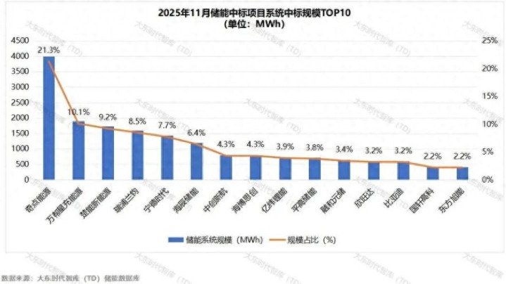2025年11月中国储能中标项目中奇点能源位居储能系统中标榜首,中标占比21.3%,万帮星充能源、楚能新能源位居前三,中标规模占比10.1%、9.2%,中国市场储能系统CR3为40.6%,CR5为56.8%。